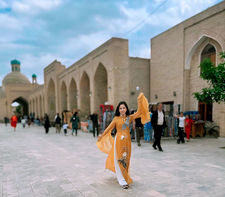 NTK Đoan Trang mặc Áo dài trang phục truyền thống của Việt Nam tung tăng trên phố tại Uzbekistan
